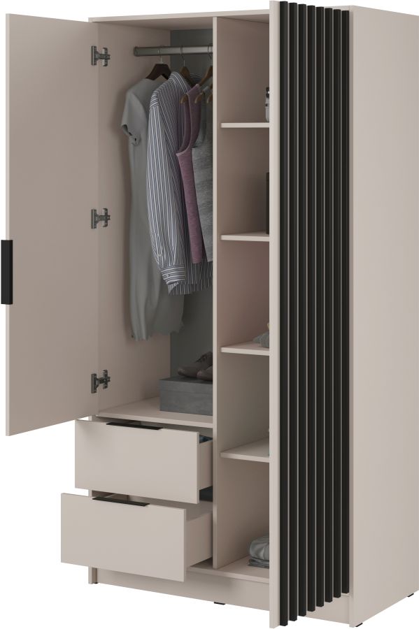 Η ντουλάπα Nelly είναι μια πρακτική επιλογή ντουλάπας που θα αποδειχθεί χρήσιμη, μεταξύ άλλων: στην κρεβατοκάμαρα, στο γκαρνταρόμπα ή στο χολ. Συνδυάζει λειτουργικότητα και μοντέρνο σχεδιασμό. Διαθέτει 2 βαθιά συρτάρια 2 αποσπώμενα εσωτερικά ράφια στο δεξί ντουλάπι και κάθετες λωρίδες από MDF 18 mm στις πόρτες. Η ντουλάπα διατίθεται επίσης σε άλλα μεγέθη και χρώματα και σε έκδοση με καθρέφτη.